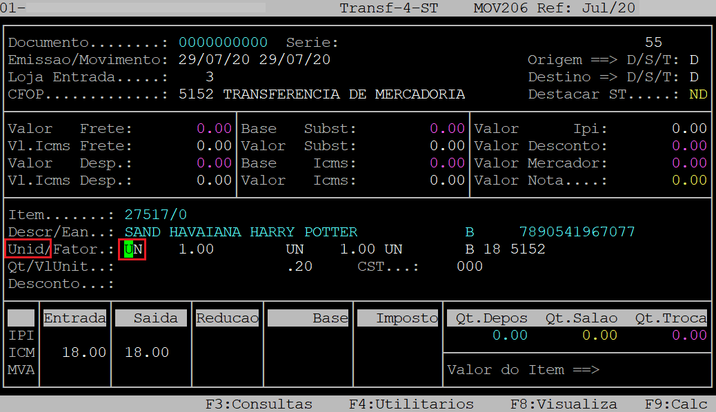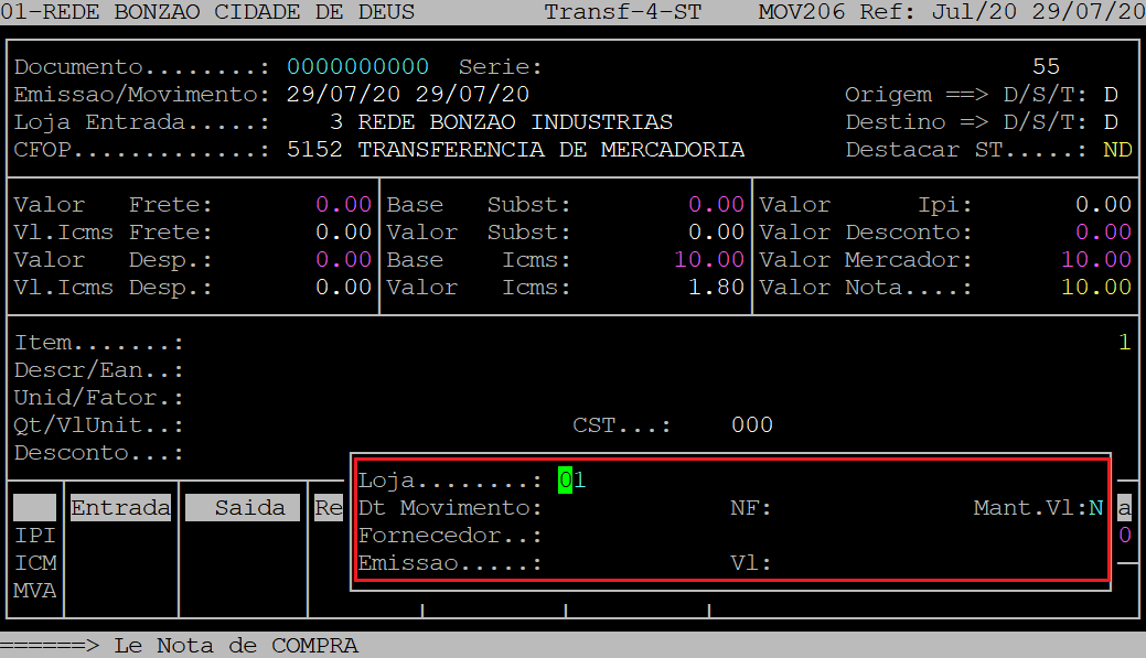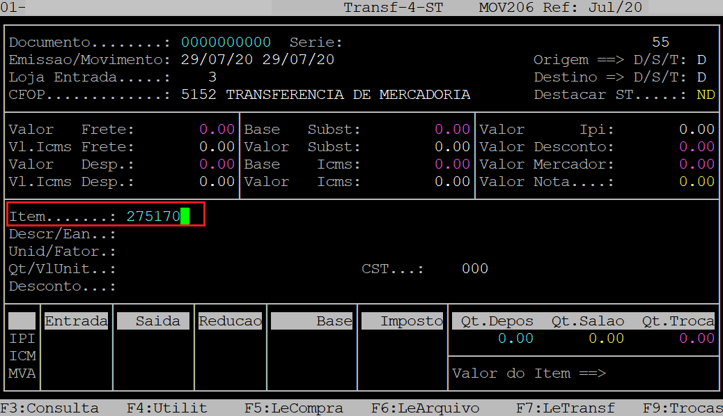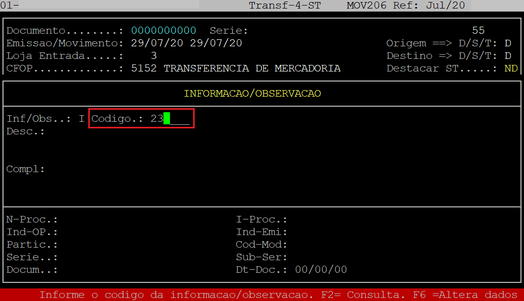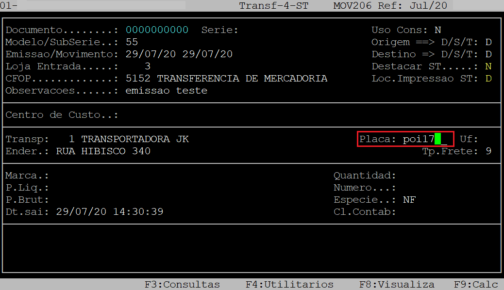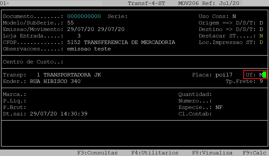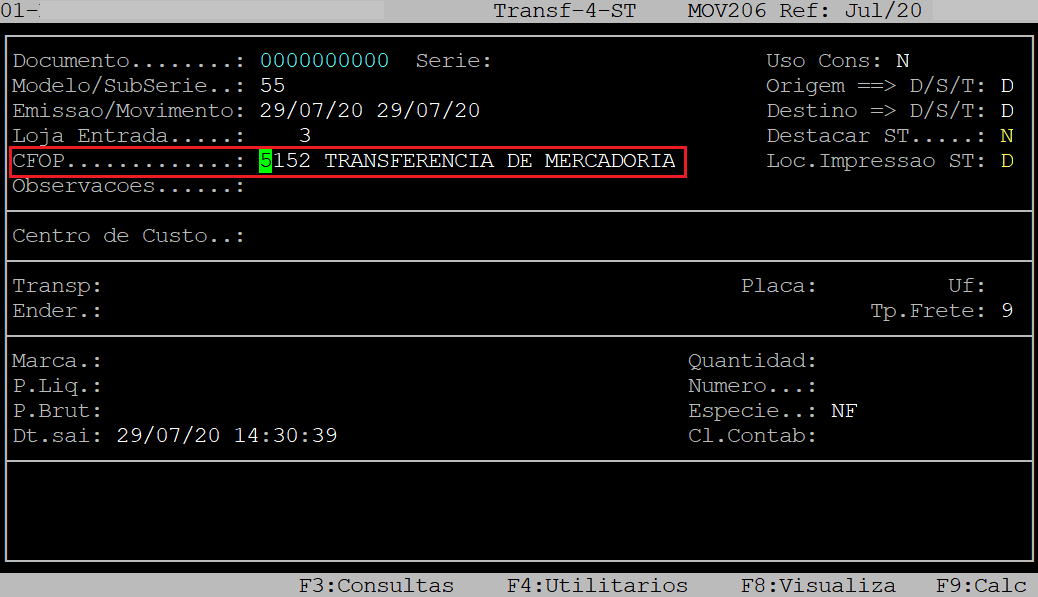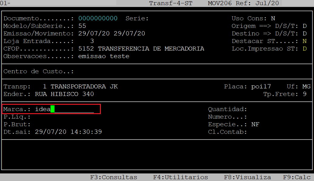 Ao acessar a rotina, pressione a tecla Enter até alcançar o campo Em Transito e, em seguida informe a letra S para configurar a nota de transferência para trânsito.