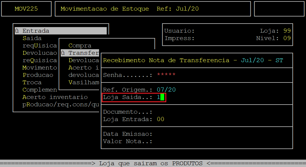 No campo Loja Saida, informe a loja em que a nota fiscal de transferência foi emitida.