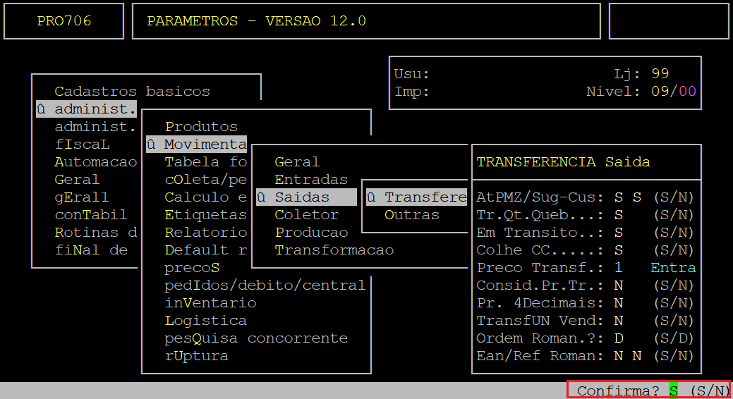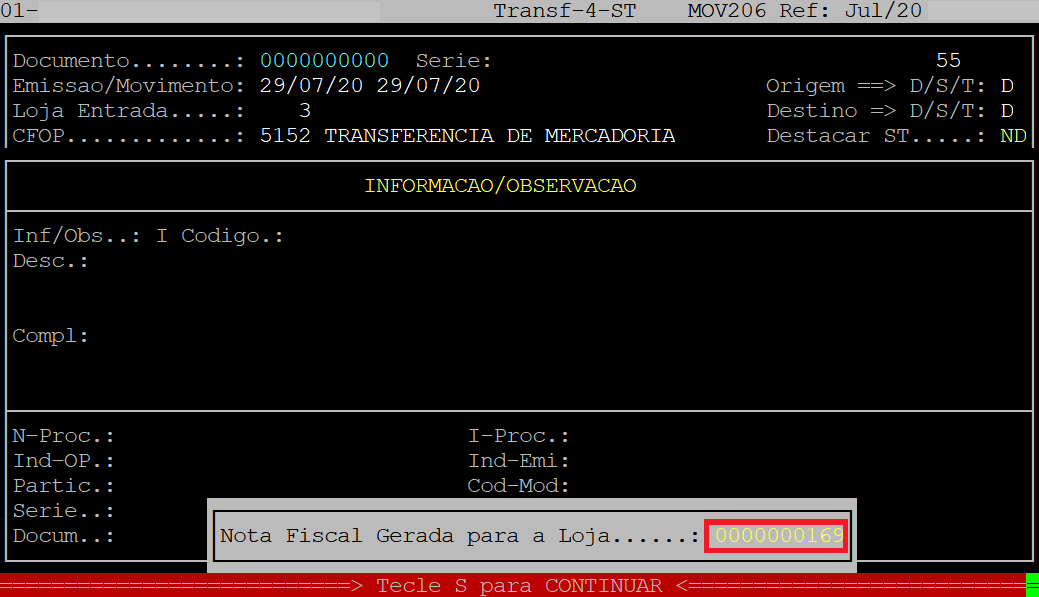 Ao ser exibida a pergunta " Confirma? ", pressione a tecla Enter ou informe a letra S para confirmar e gerar o número da nota fiscal de transferência.