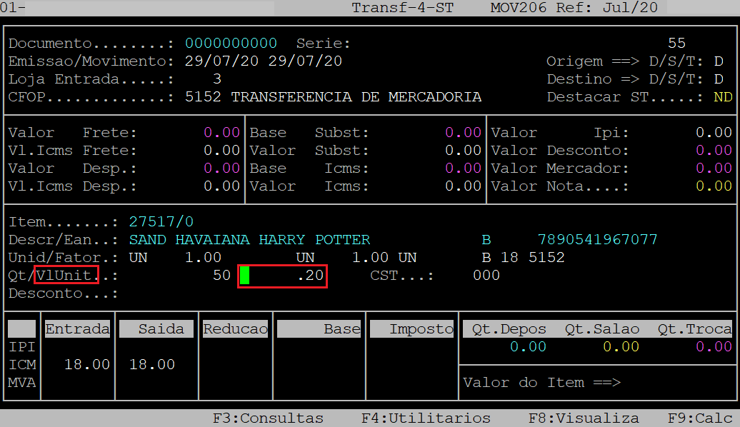 No campo VlUnit, informe o valor unitário do produto ou pressione a tecla Enter para manter o preço definido no tópico 1 - Parametrizando Nota de Transferência em Trânsito.