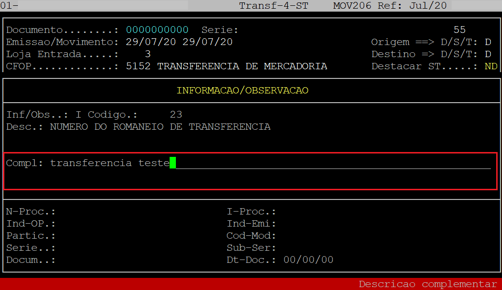 No campo Compl, digite um complemento para a informação ou observação e, pressione a tecla Enter para prosseguir.