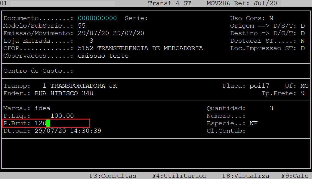 No campo P.Brut, informe o peso bruto da mercadoria a ser conduzida pela transportadora e, pressione a tecla Enter para prosseguir.