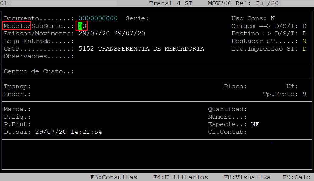 Ao acessar a rotina, no campo Modelo, informe o modelo da nota de transferência.