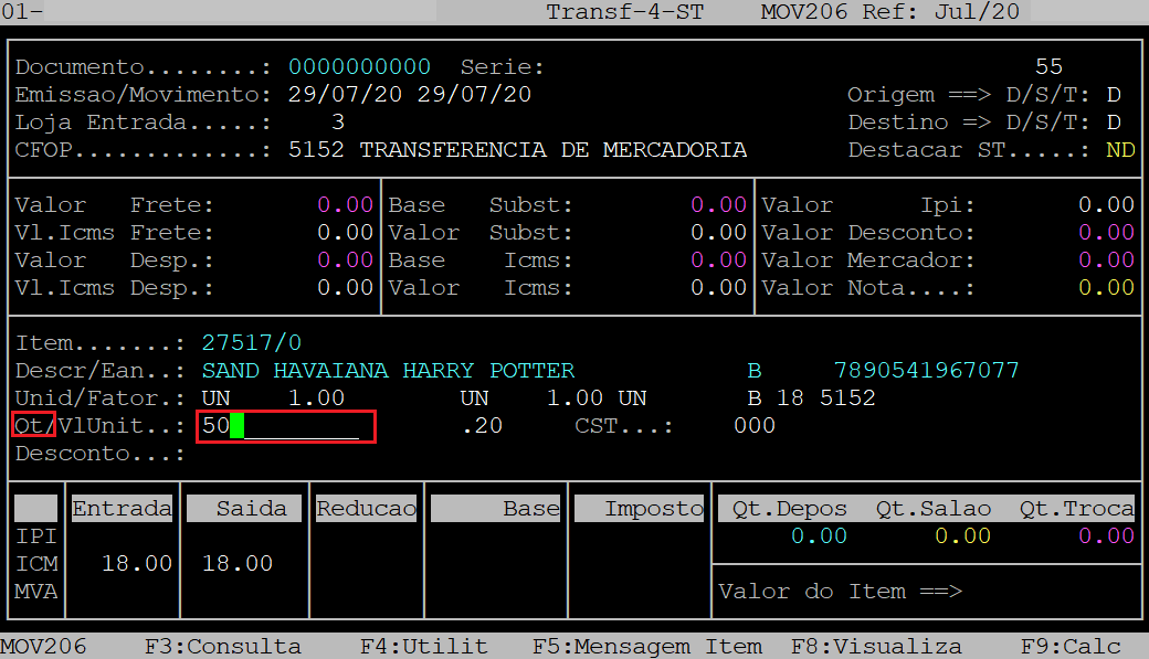 No campo Qt, informe a quantidade do produto que deseja transferir e, pressione a tecla Enter para prosseguir.