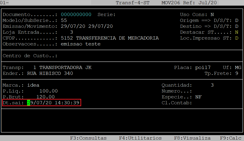 No campo Dt.sai, informe a data de saída da mercadoria e, pressione a tecla Enter. No campo seguinte, informe o horário de saída da mercadoria e, pressione a tecla Enter para prosseguir.
