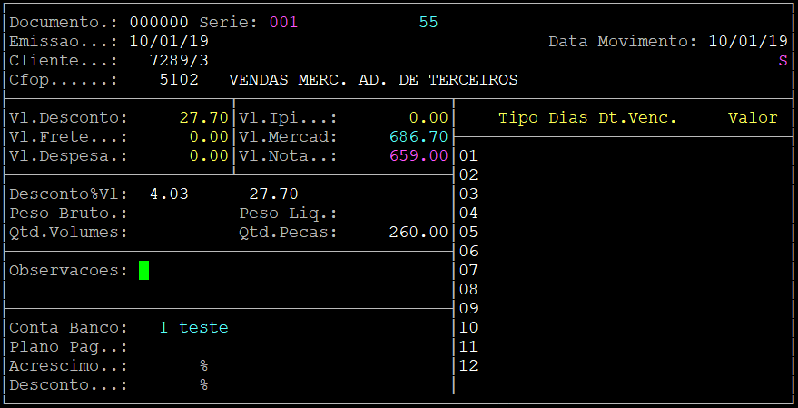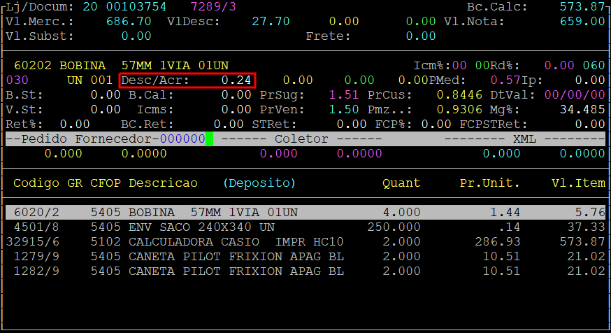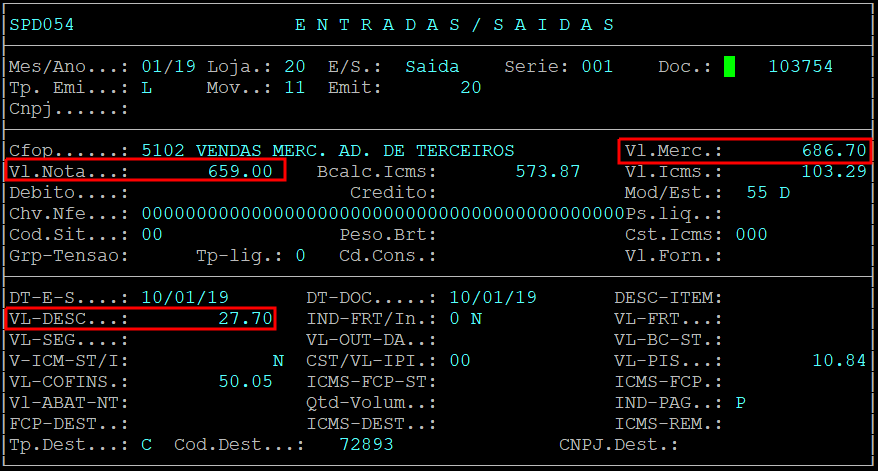 Observe no exemplo acima, que o campo Vl-Desc foi preenchio com o valor do desconto informado na emissão da nota, no qual o valor total da nota (campo Vl. Nota) é o valor da mercadoria (campo Vl. Merc) menos o desonto (campo Vl-Desc).