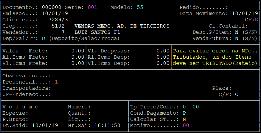 Exemplo de Emissão de Nota Fiscal - Informando o Cliente
