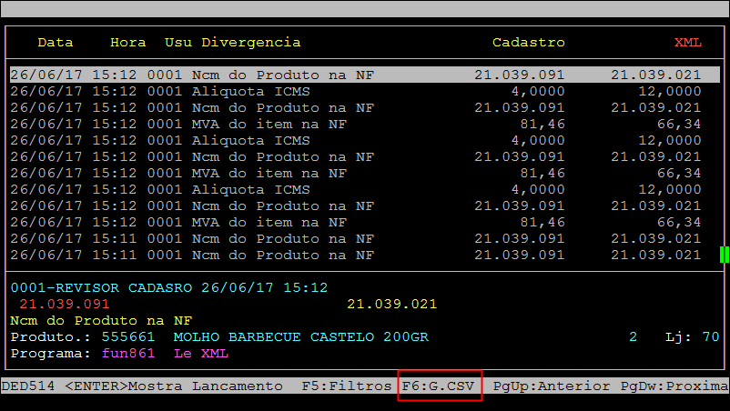 A seguir pressione F6 para selecionar a função que gera o arquivo CSV.