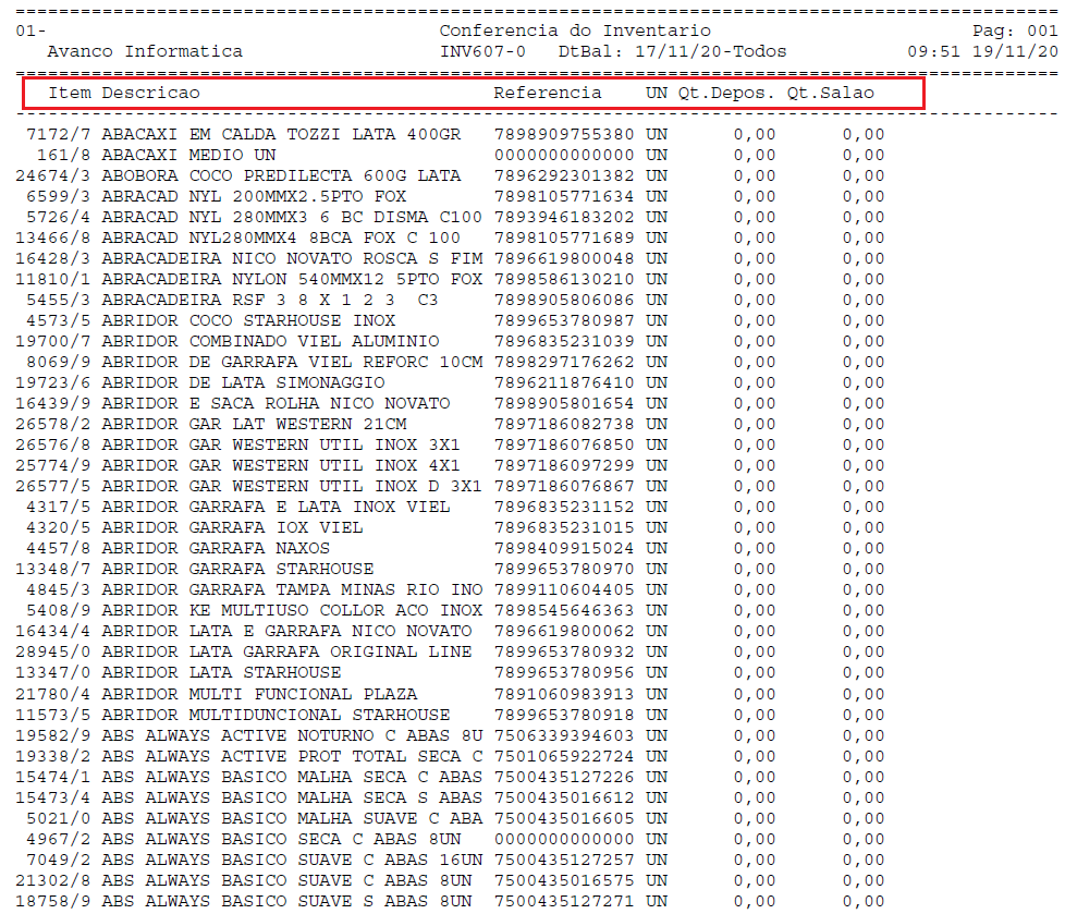 | Qt.Salao: | Refere-se a quantidade inventariada no salão do produto. |