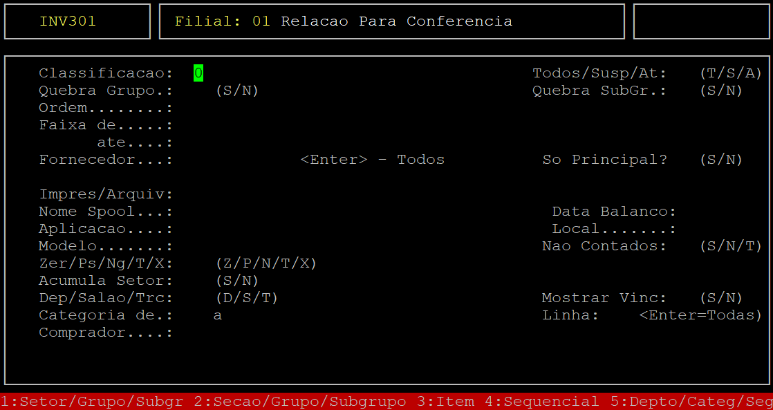 | Classificacao: | Informe o número correspondente a classificação dos produtos que deseja visualizar no relatório, sendo eles: 1 - setor/grupo/subgrupo, 2 - seção/grupo/subgrupo, 3 - item, 4 - sequencial, ou 5 - departamento/categoria/segmento. | |