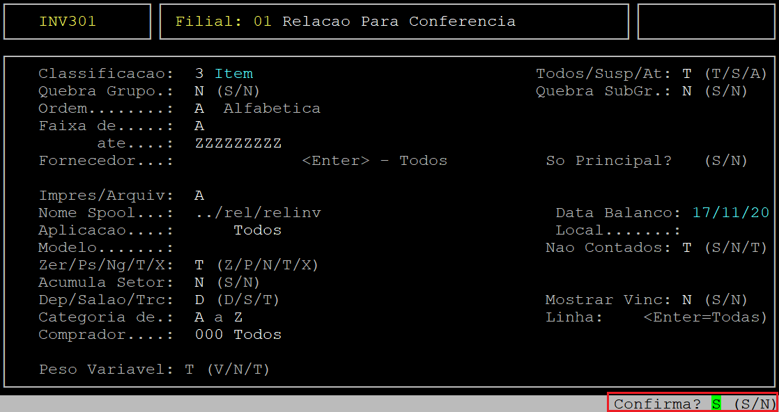 | Todos/Susp/At: | Informe a letra S para exibir no relatório itens suspensos, ou A para exibir itens ativos, ou T para exibir todos. | |