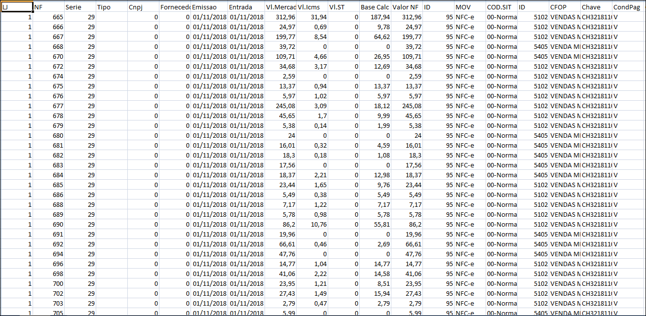 Exemplo do Relatório de Notas Fiscais do Movimento em .CSV