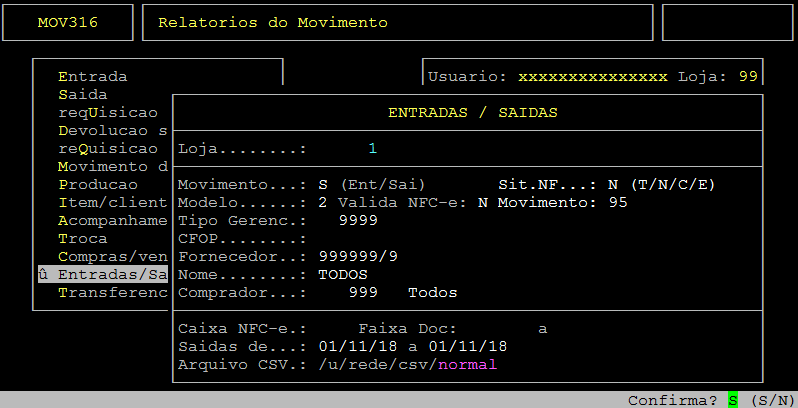 Informe a letra S para o movimento de saída ou E para o de entrada. |