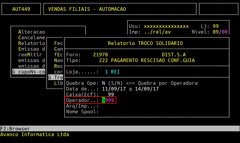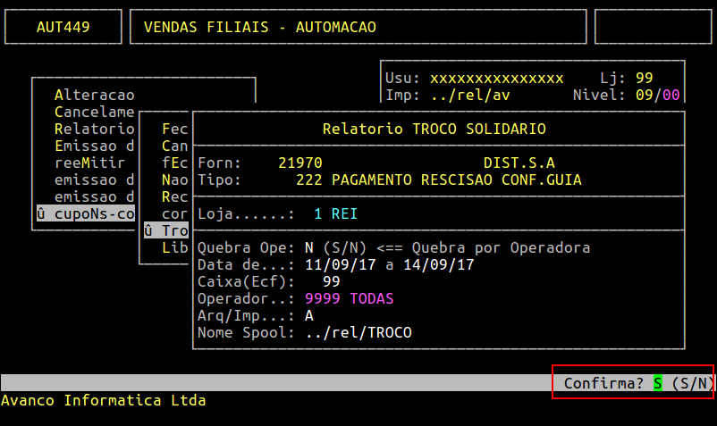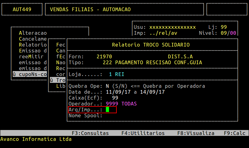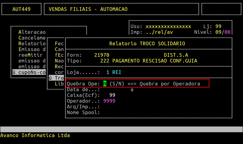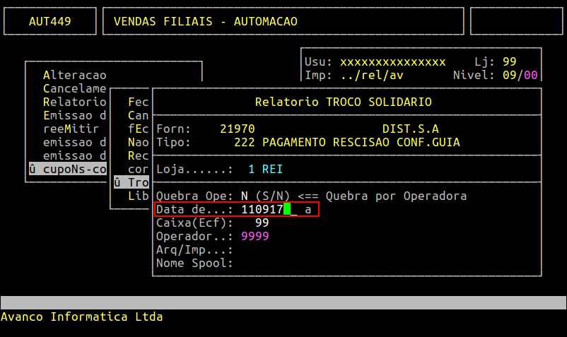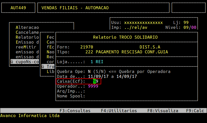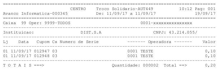 Localização: | Vendas - Automação / Cupons - Consultas / Troco Solidário / Relatório |