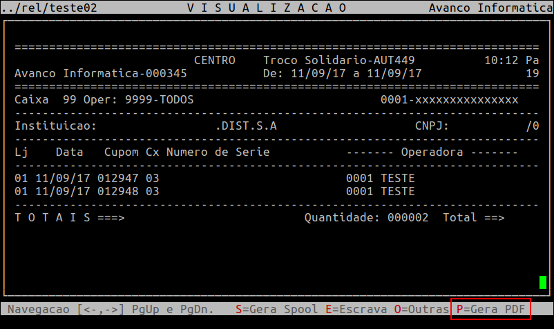 Pressione P para gerar o relatório em PDF, conforme indicado na tela anterior, o qual está disponível no diretório "/u/rede/rel-pdf".