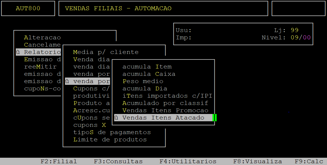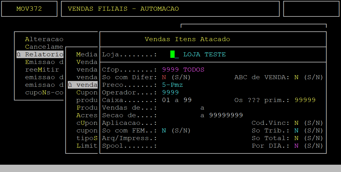 Para emitir o relatório de vendas de itens de atacado, acesse a localização citada acima. Utilize as setas do teclado para selecionar os caminhos e, pressione a tecla Enter para confirmá-los.