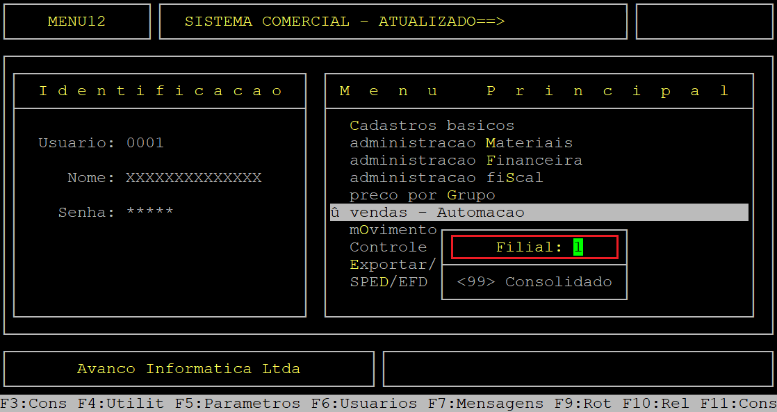 Caso possuir mais de uma loja configurada no cadastro de usuário, o sistema exibirá a janela de Filial, no qual deverá informar o número da loja desejada.