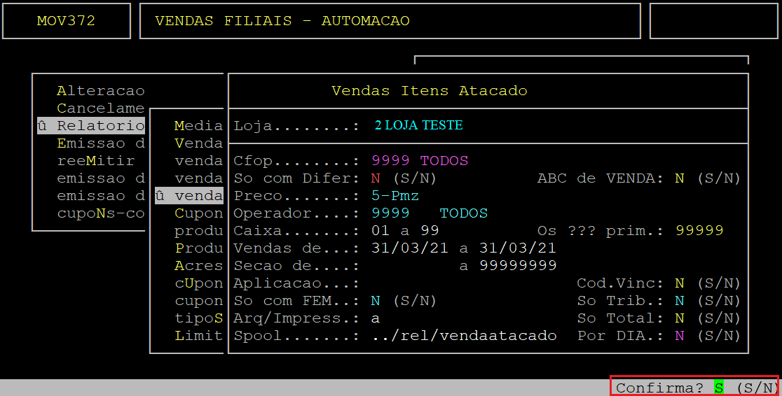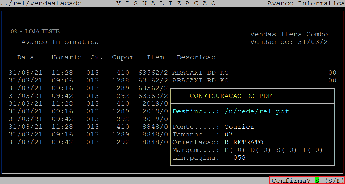 Logo após, o sistema exibirá a pergunta "Confirma?", no qual deverá apertar a tecla Enter ou S para confirmar e gerar o relatório.