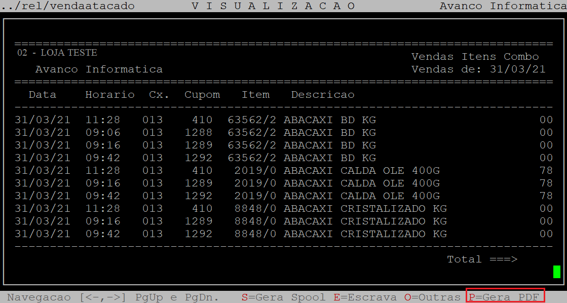So. Total: | Informe a letra S para gerar o relatório apenas com o total das vendas, ou N para gerar o relatório detalhado. |