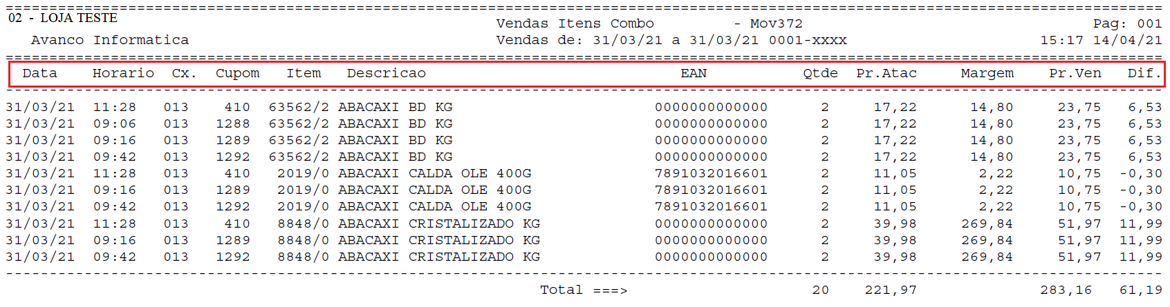 Abaixo segue a descrição das colunas do relatório gerado: