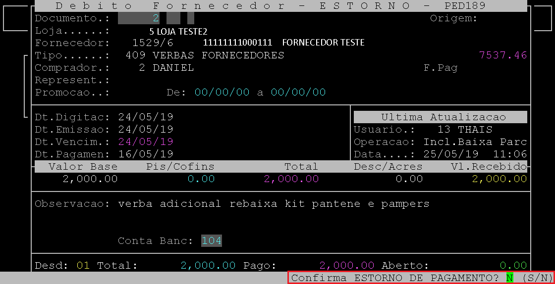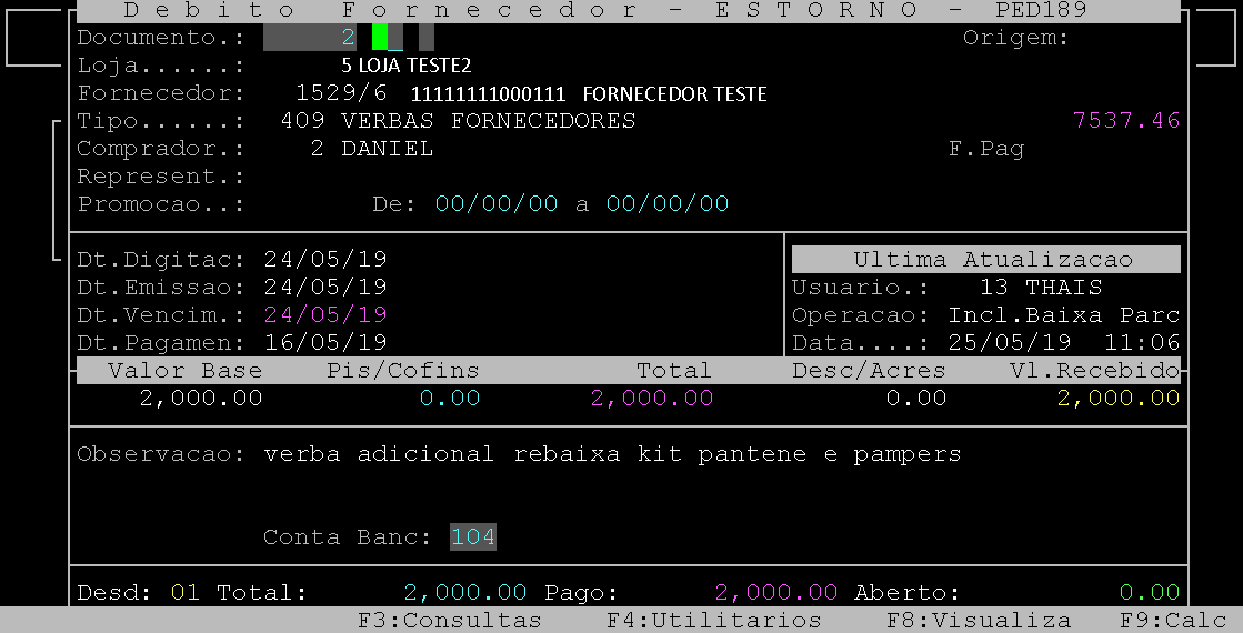Logo após, pressione a tecla Enter uma vez para carregar os dados do débito de fornecedor para conferência.