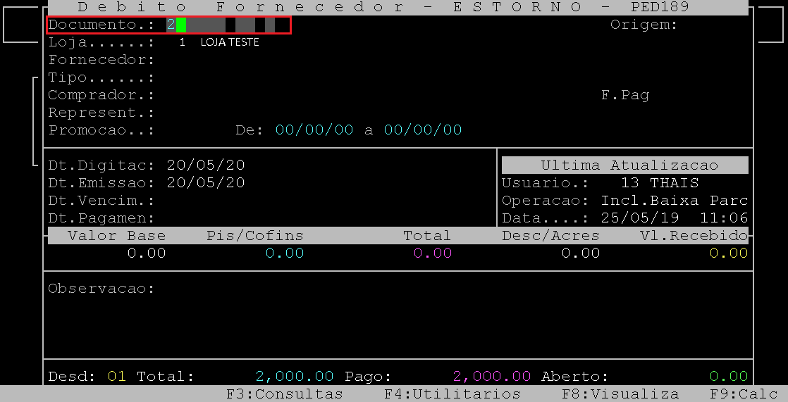 Ao acessar a rotina, no campo Documento informe o número do documento de débito de fornecedor que deseja estornar.