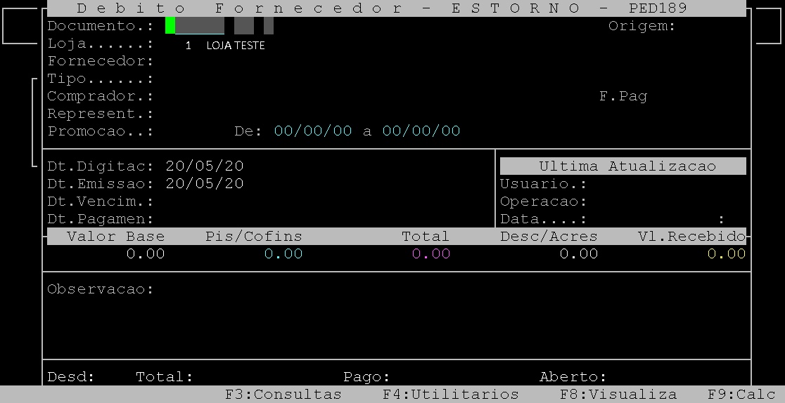 Rotina: | Débito Fornecedor - Estorno |