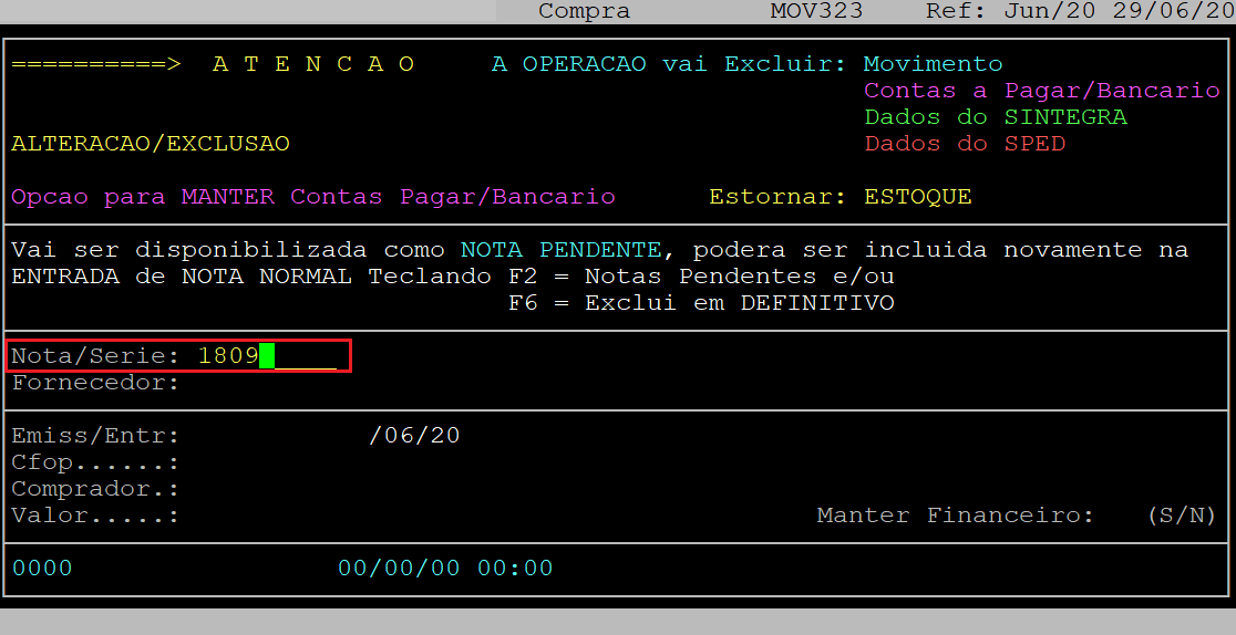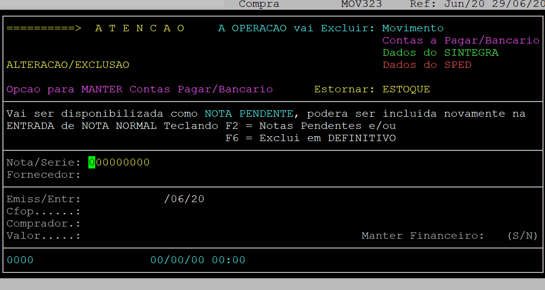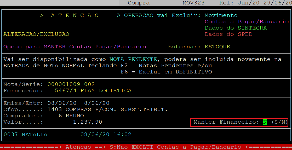 Em seguida, pressione a tecla Enter até alcançar o campo Manter Financeiro. Nesse campo, informe a letra S se desejar excluir a nota fiscal da rotina de movimento e manter a mesma no financeiro (contas a pagar e bancário), ou informe a letra N para excluir a nota fiscal do movimento e do financeiro.