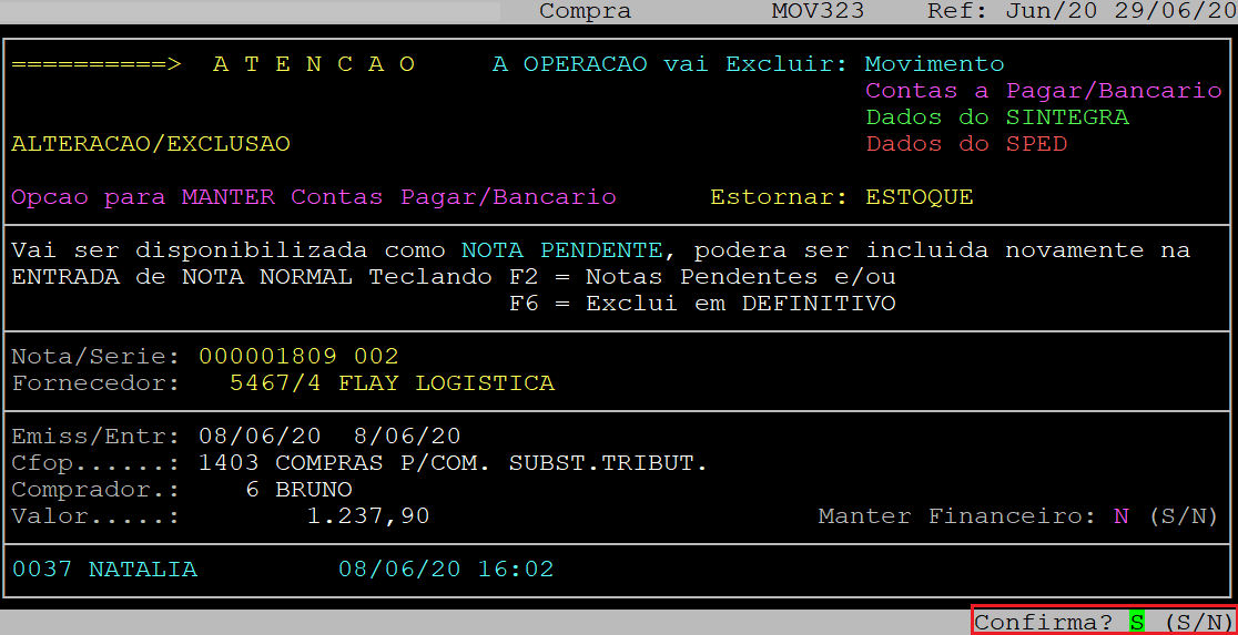 Em sequência, o sistema exibirá a pergunta "Confirma?", no qual deverá informar a letra S para excluir a nota fiscal de entrada, conforme o exemplo abaixo.