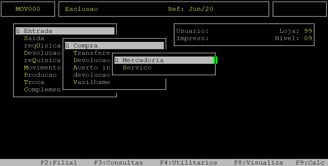 Localização: | Administracao Materiais / Gestao de Estoque / Gerenciamento Filial / Entradas e Saidas / Alteracao - Cancelamento / Exclusao / Entrada / Compra / Mercadoria |