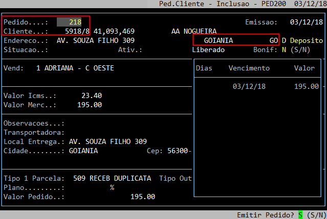 Abaixo segue um exemplo da segunda tela da inclusão do pedido, já com o número do pedido gerado.