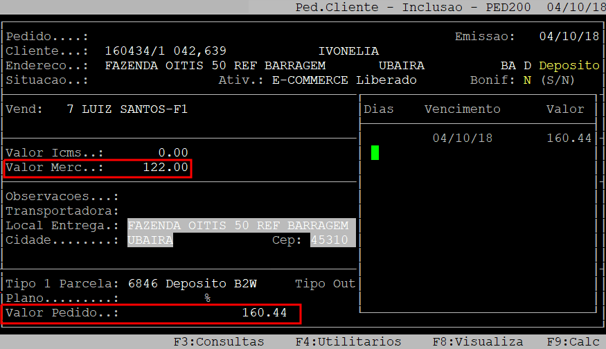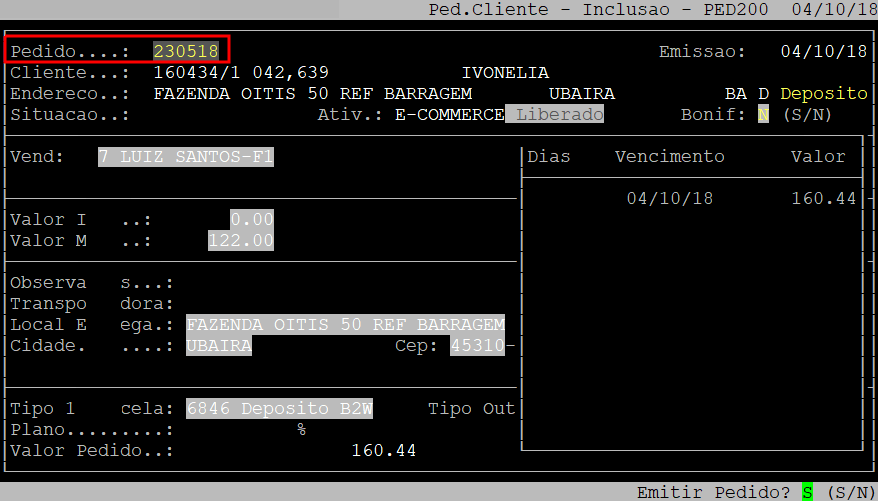 Abaixo, seguem o exemplo da inclusão do pedido.