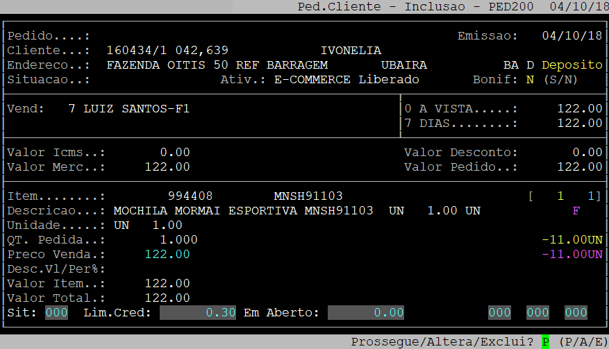 Localização: | Administracao de Materiais / Gestao de Vendas / Pedidos / Inclusao |