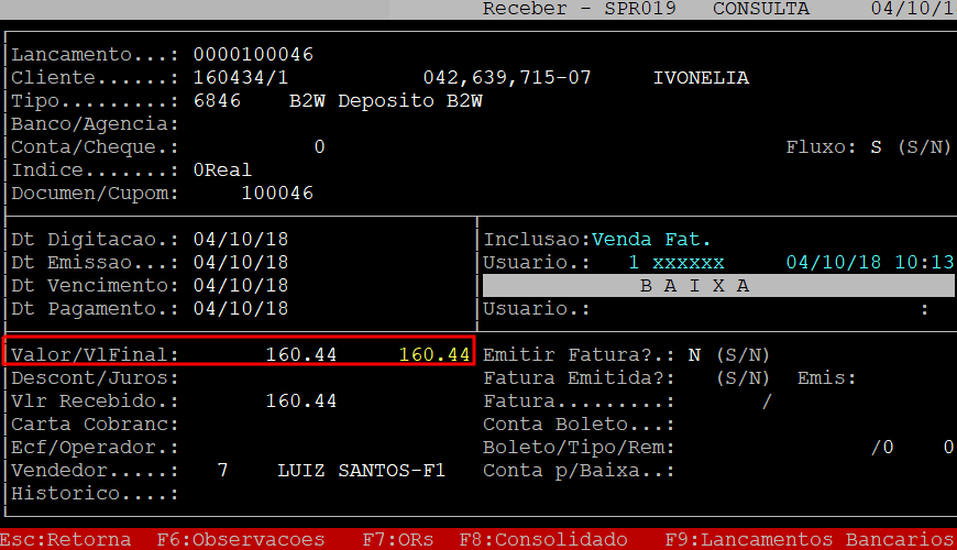 Localização: | Administracao Financeira / Contas a Receber / Lancamentos / Manutencao / Alteracao / Individual |