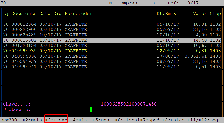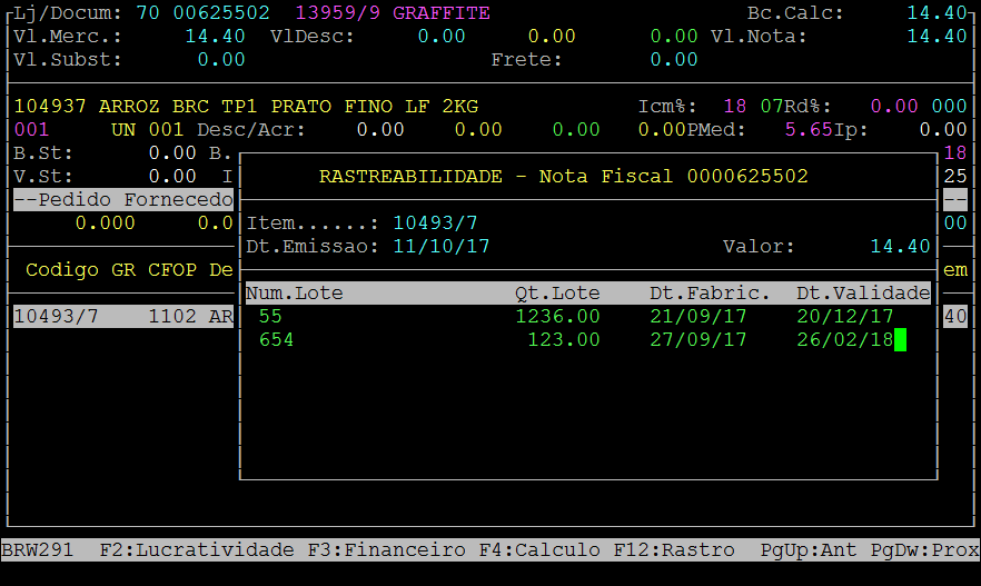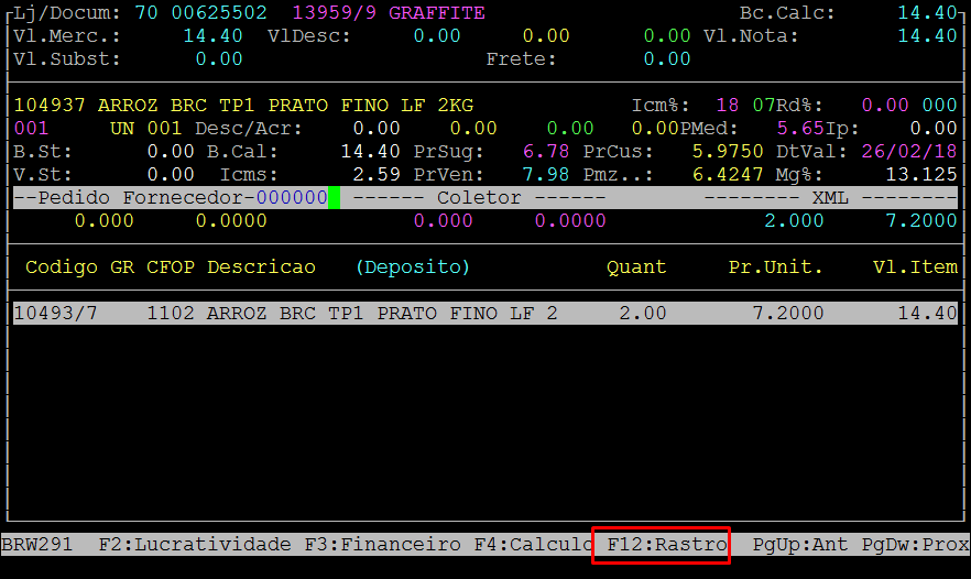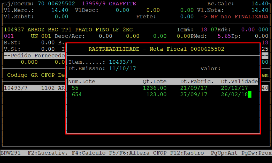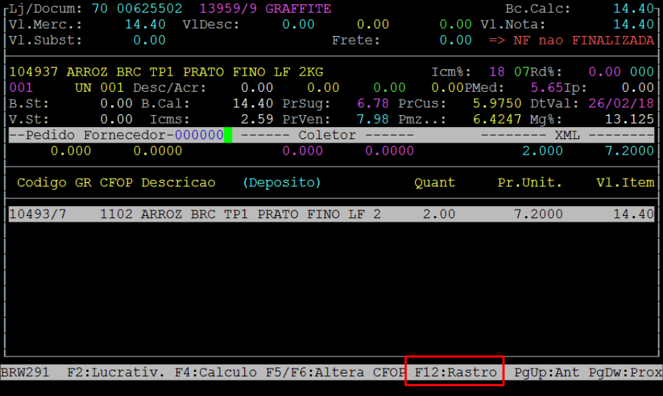 Na tela de digitação dos itens deve ser selecionada a função F12 - Rastro para visualizar os dados de rastreabilidade do item.