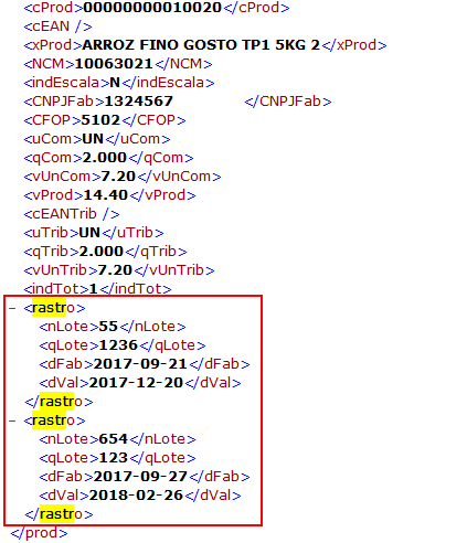 Segue abaixo um exemplo de arquivo.xml contendo os dados de rastreabilidade: