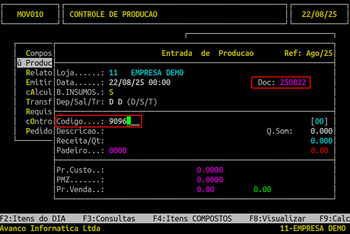 Logo após, o sistema exibirá no campo Doc o número do documento de produção a ser gerado.