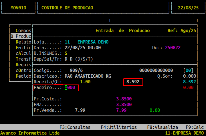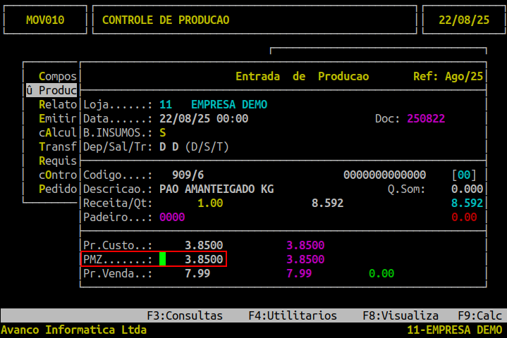 No campo PMZ, o sistema carrega automaticamente o PMZ do produto, conforme a rotina de Composição de Produção. Pressione a tecla Enter para manter o valor e prosseguir, ou altere conforme o desejado e pressione a tecla Enter para confirmar o novo valor.