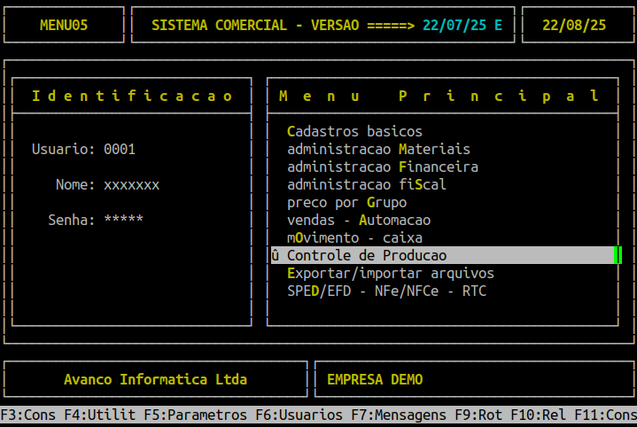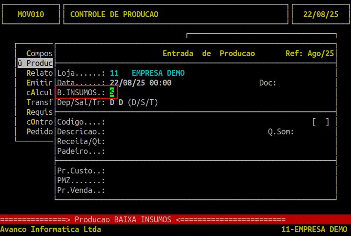 Ao acessar a rotina, no primeiro parâmetro do campo B.INSUMOS, o sistema preenche automaticamente com o padrão S para que ao gerar a produção o estoque dos insumos seja baixado. Porém, se desejar alterar para não baixar o estoque, informe a letra N.