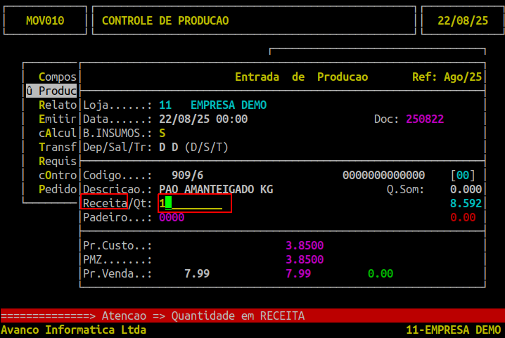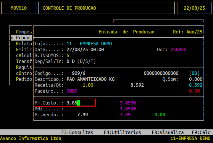 No campo Pr. Custo, o sistema carrega automaticamente o preço de custo do produto, conforme a rotina de Composição de Produção. Pressione a tecla Enter para manter o valor e prosseguir, ou altere conforme o desejado e pressione a tecla Enter para confirmar o novo valor.