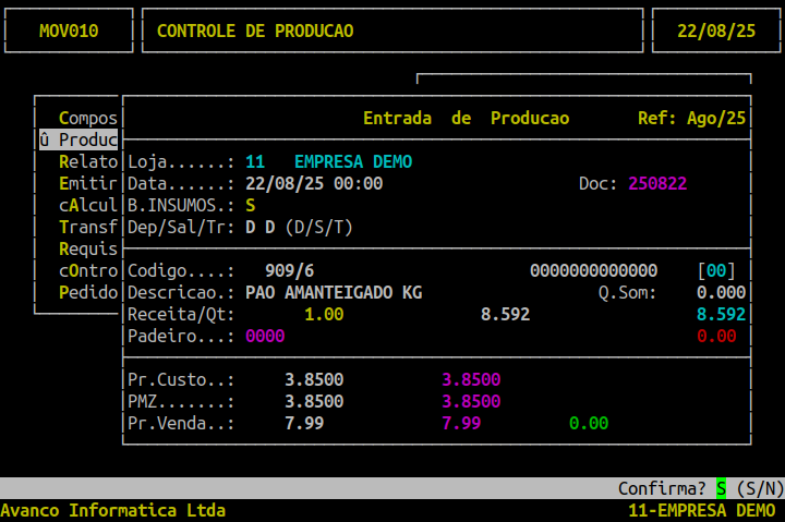 Em seguida, o sistema exibirá a pergunta " Confirma? ", no qual deverá pressionar a tecla Enter ou informar a letra S para confirmar e gerar a produção.