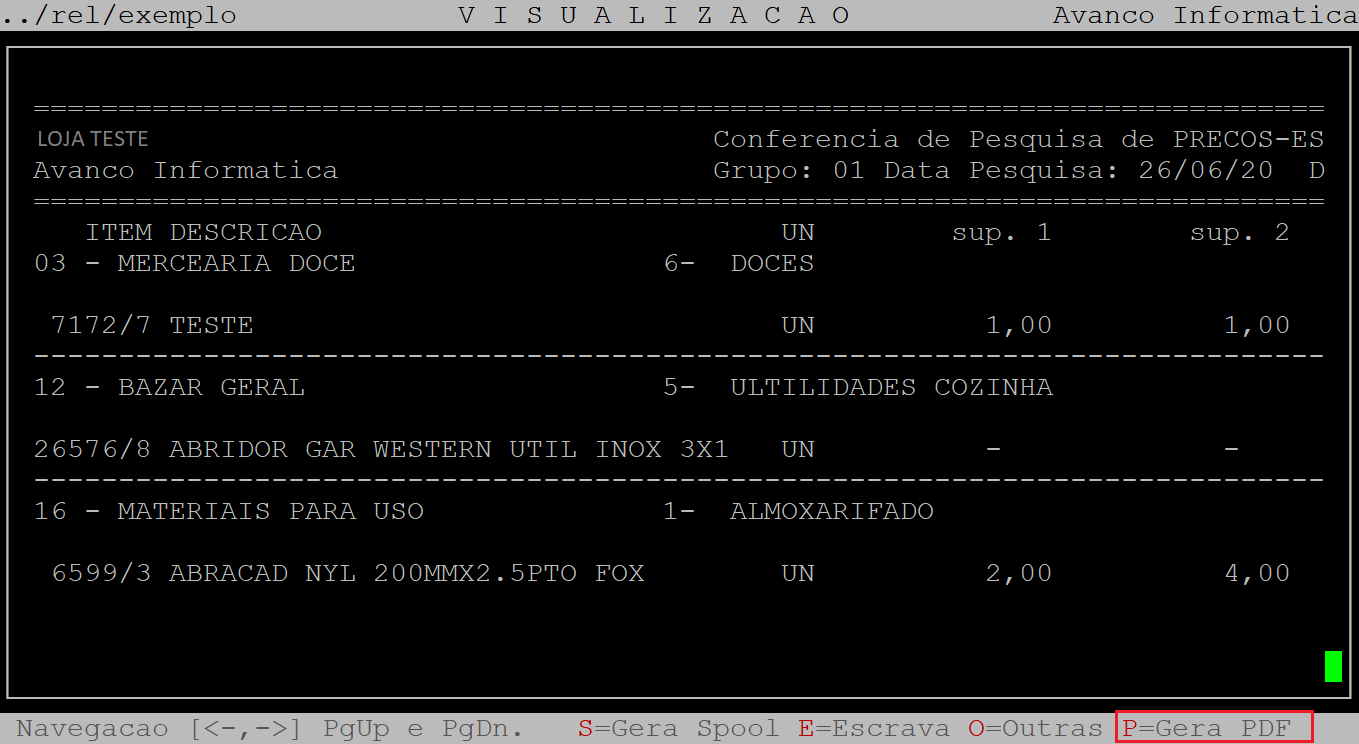 Se desejar visualizar em pdf, em seguida, deverá pressionar a tecla P e depois a tecla Enter até confirmar, para gerar o relatório na pasta /u/rede/rel-pdf, conforme exemplo abaixo.