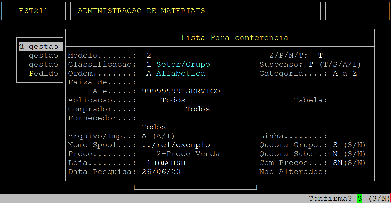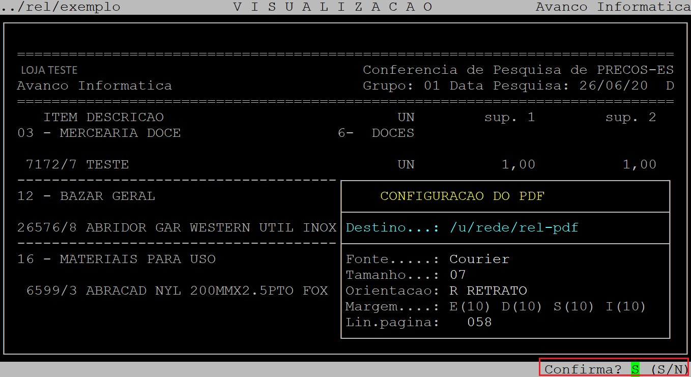 Assim que preencher os campos citados no quadro acima, pressione a tecla Enter ou S para confirmar e gerar o relatório.