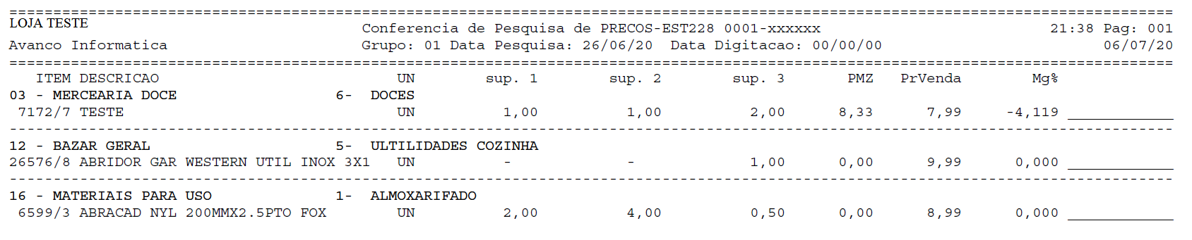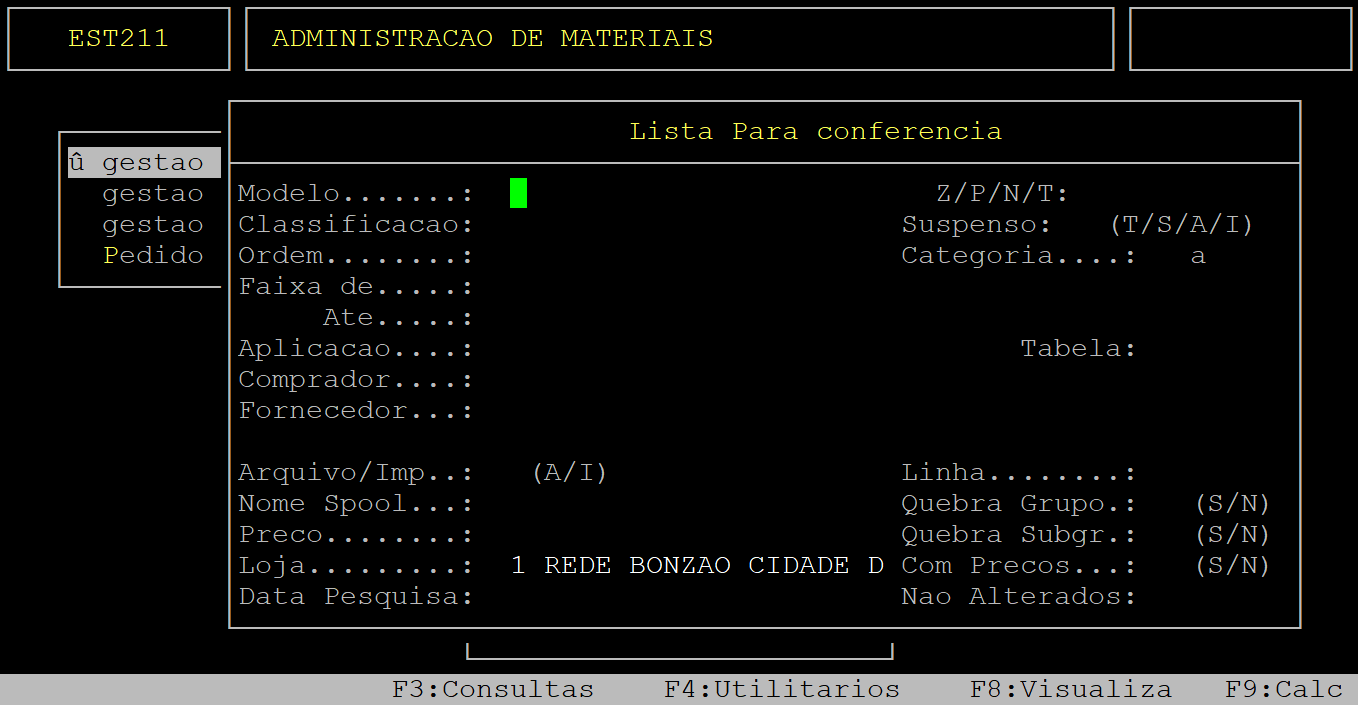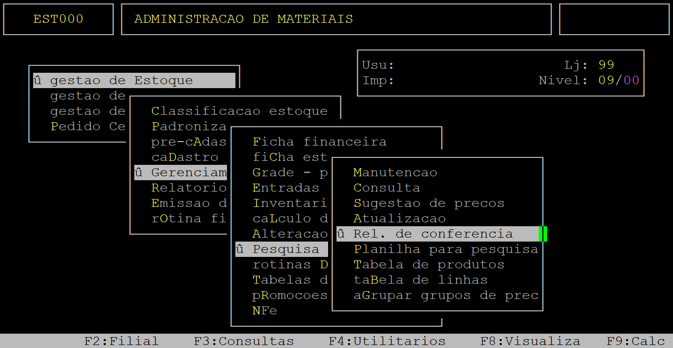 Localização: | Adm Materiais / Gestao de Estoque / Gerenciamento Filial / Pesquisa de precos / Rel. de conferencia |