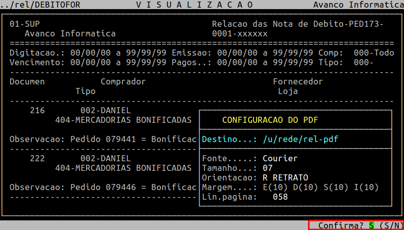 Se desejar visualizar em pdf, em seguida, deverá pressionar a tecla P e a Enter até confirmar para gerar na pasta /u/rede/rel-pdf (conforme exemplo abaixo).