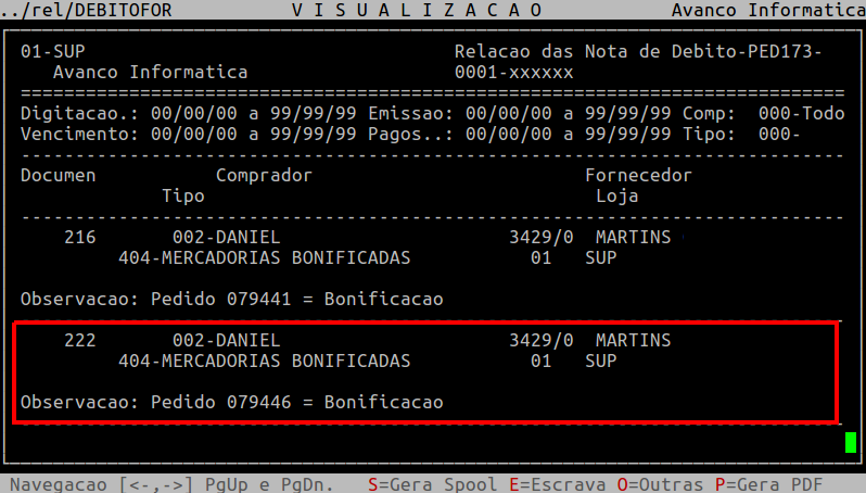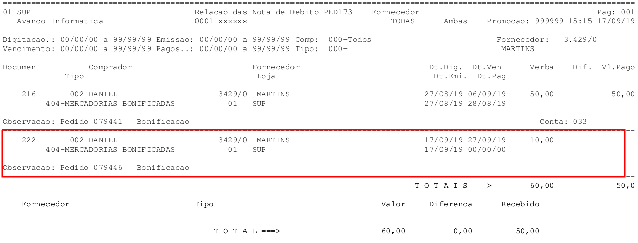 Exemplo de Relatório de Débito Fornecedor a partir do Pedido Bonificado