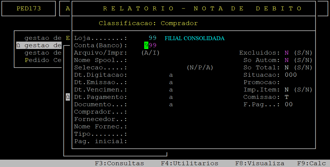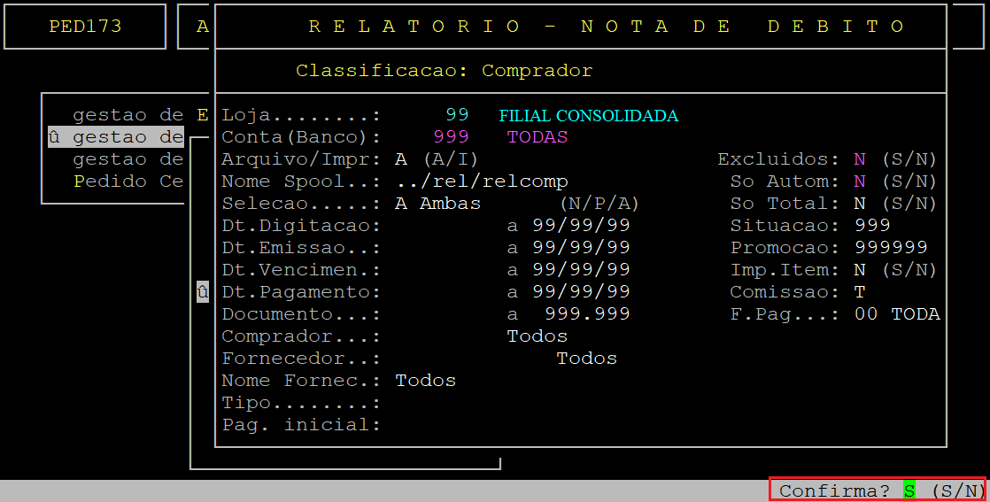 Informe a letra S para exibir só débitos que foram gerados automaticamente no relatório, ou N para não exibir. Para alcançar esse campo é necessário utilizar a seta do teclado para cima. |