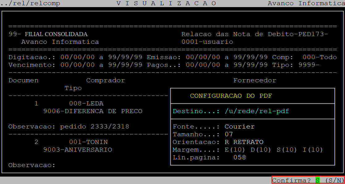Assim que preencher os campos acima, pressione a tecla Enter ou S para confirmar e gerar o relatório, conforme o exemplo abaixo.