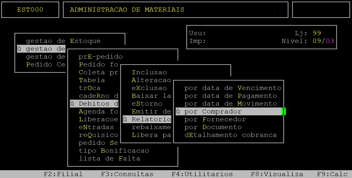 Para gerar relatório de débitos de fornecedor por comprador, acesse a localização citada acima.