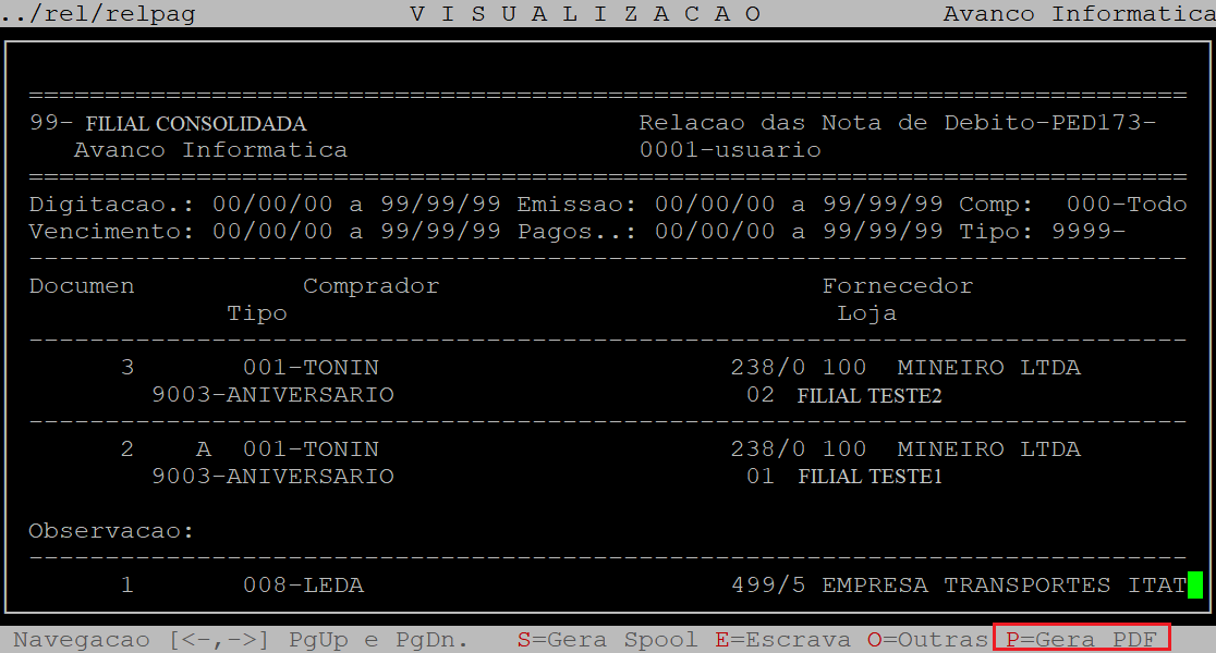 Assim que preencher os campos acima, pressione a tecla Enter ou S para confirmar e gerar o relatório, conforme o exemplo abaixo.